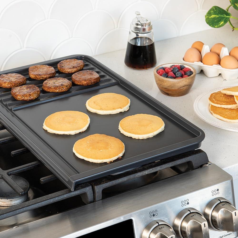 This versatile, family-sized grill griddle featuers both a ridged grill zone and a smooth griddle surface. You can cook multiple foods at once — from sizzling proteins and seared veggies to perfectly fried eggs, hashbrowns, or toasted buns.
