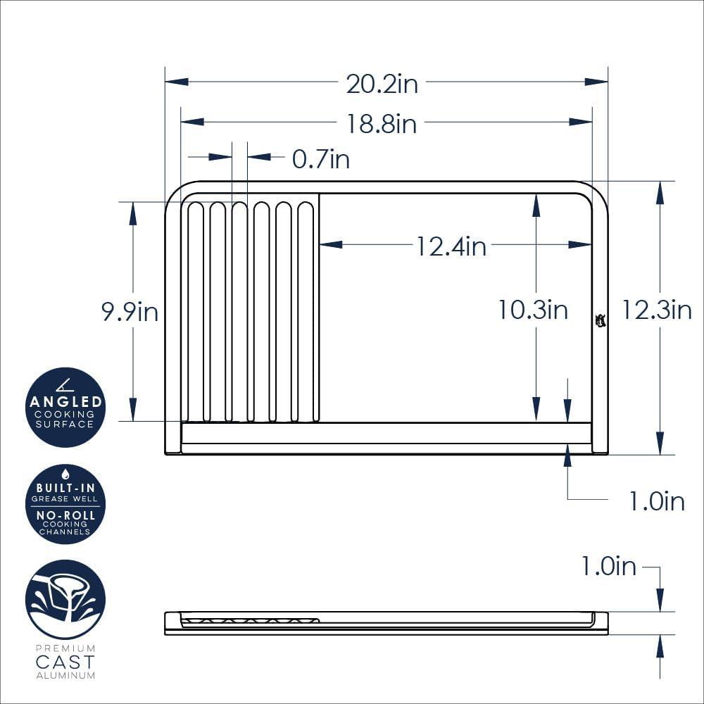 Spanning two burners, this griddle offers maximum cooking capacity, making it easy to prepare meals for the whole family all on one pan. Exterior measurement of 20.2x 12.3 x 1 inches, the full dual cooking surfaces measure 18.8 x 10.3 inches. More details on griddle size and cooking surface dimensions are displayed in the dimensional drawing.