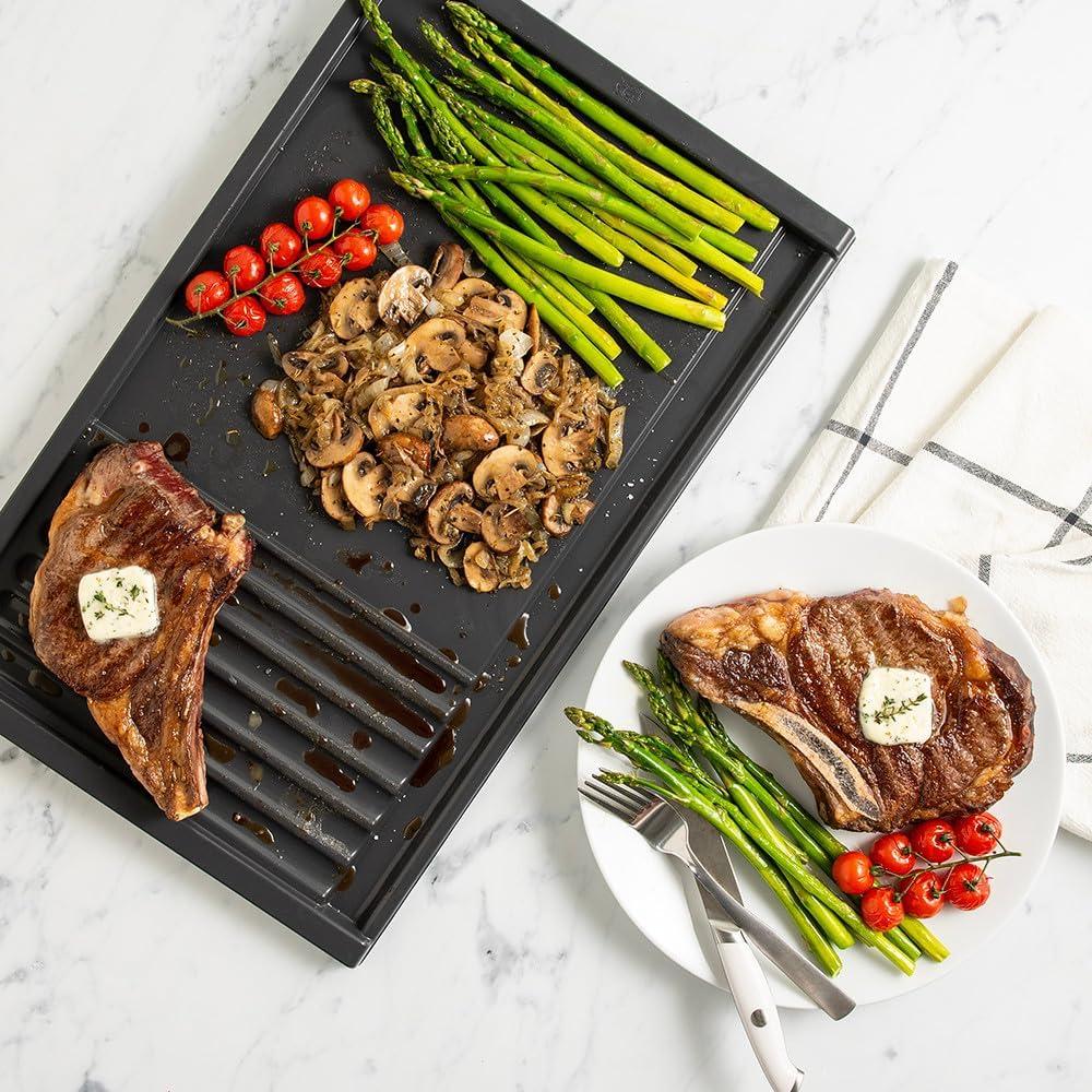 High sides help contain splatters, while a sloped surface and drip lip efficiently drain away excess oils and juices for healthier results. Compatible with gas, electric, and ceramic stovetops — and oven and grill safe up to 475°F — it’s your go-to solution for everything from hearty breakfasts to grilled dinners.
