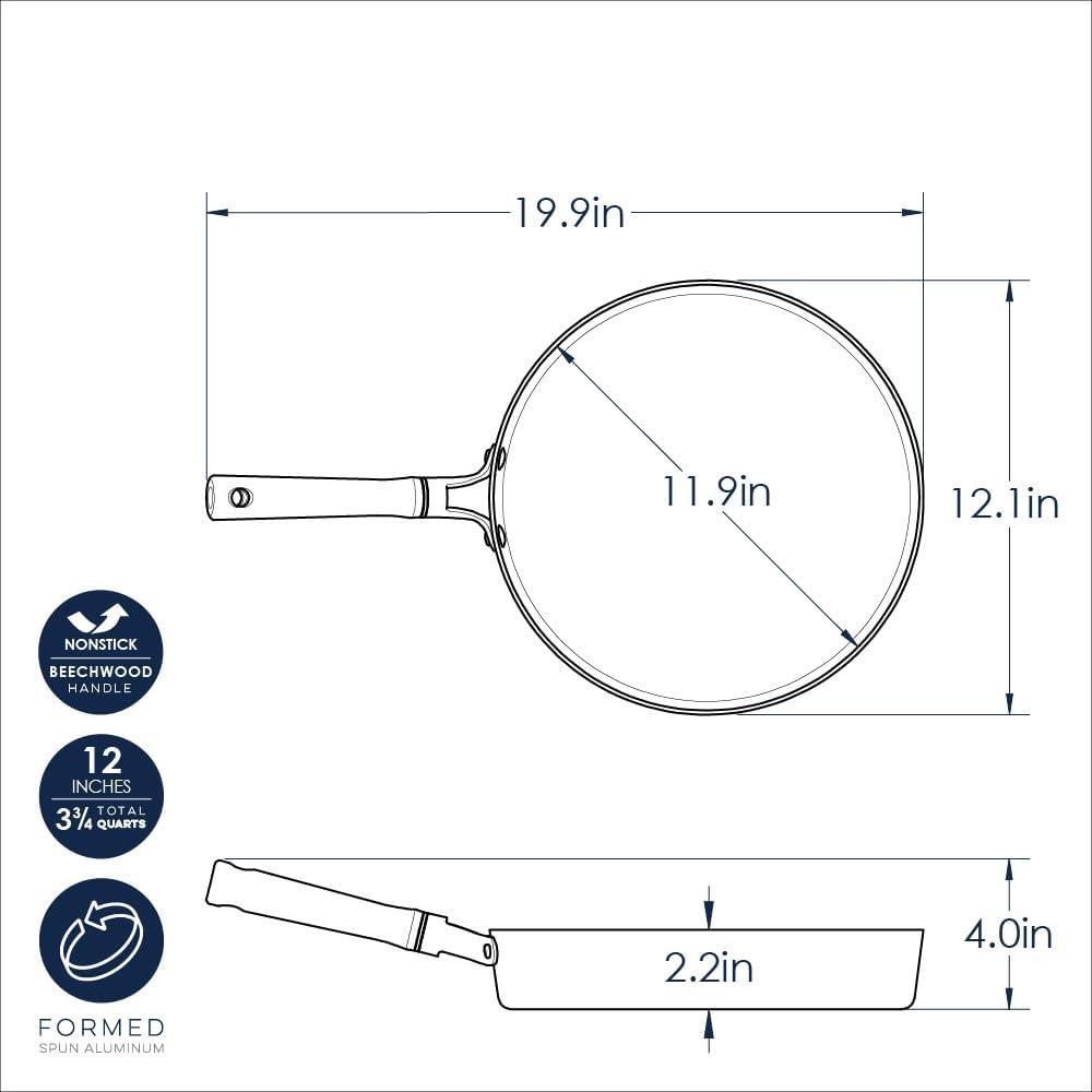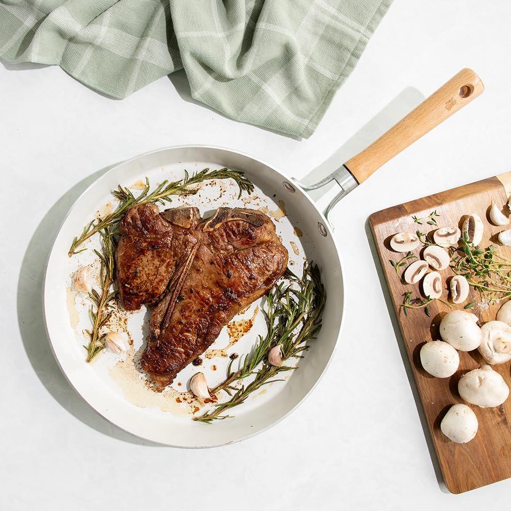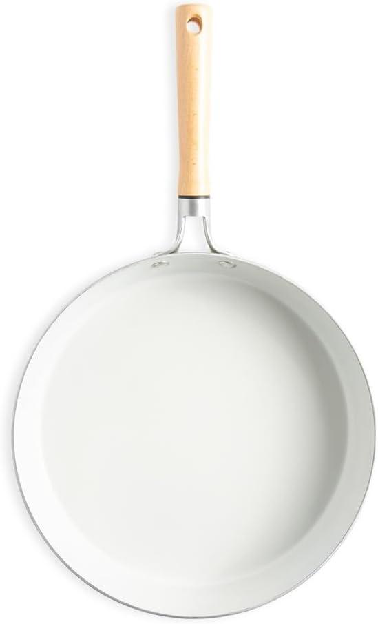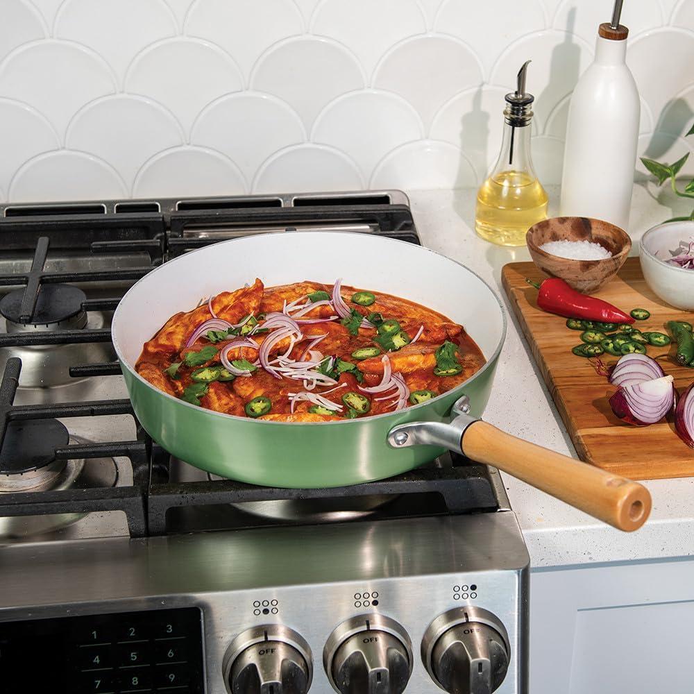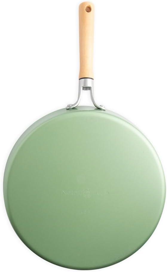 Upgrade your old cookware with our beautiful and versatile Cardamom™ Nonstick Fry Pans, a ceramic nonstick high-quality pan made without PFAS, PTFE or PFOA. Cardamom™ takes its name and its fresh green color from one of the world’s most versatile spices. A nod to our Scandinavian heritage, this collection blends modern design with natural warmth, made for healthy cooking and sharable moments. Bring elegance and performance to your stovetop with the 12 Inch Cardamom Fry Pan. Designed for bigger meals and bold flavors, this aluminum pan’s generous surface and ceramic nonstick coating make it ideal for family dinners, one-pan meals, and hearty breakfasts. With its wide base and Scandinavian-inspired wood handle, it’s where form meets function beautifully. Compatible with gas, electric, and ceramic stovetops. Clean handle by wiping with a damp dish rag if needed This pan is not dishwasher safe due to its wooden handle which will absorb water and cause cracking or splitting. Made in America of domestic and imported materials and components.