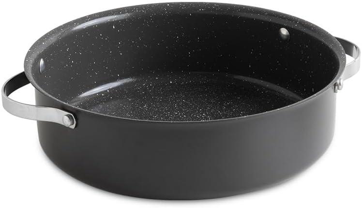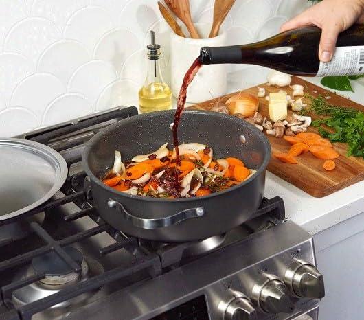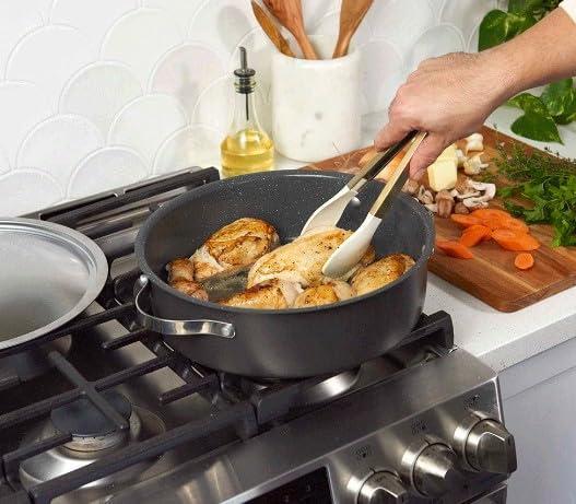 Families shouldn’t have to choose between performance and safety when it’s time to prepare a meal. Our consciously clean Verde Cookware is a healthier and safer choice, featuring the most advanced 3-layer nonstick ceramic coating for lasting durability and made without PFAS, PTFE, or PFOA. Made of aluminized steel for rapid and even heating which makes them induction ready and safe for use on gas and electric stovetops. They can also easily transition to the oven to finish off meals, oven-safe to 350°F. The riveted stainless handles make cooking enjoyable with comfortable stay-cool, silicone grips too. This exceptional ceramic cookware collection is designed for professional-grade cooking for an affordable cost. The braiser is designed for slow cooking, braising, searing, and one-pan meals, making it a must-have for any kitchen. Made in America of domestic and imported materials and components.
