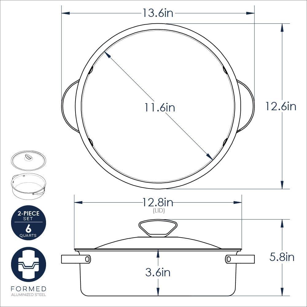 This 6 quart braiser pan with lid is designed for slow cooking, braising, searing and one-pan meals, making it a must-have for any kitchen. Detailed pan measurements are listed on the drawing image but the interior is 11.6 inches in diameter and 3.6 inches in height.